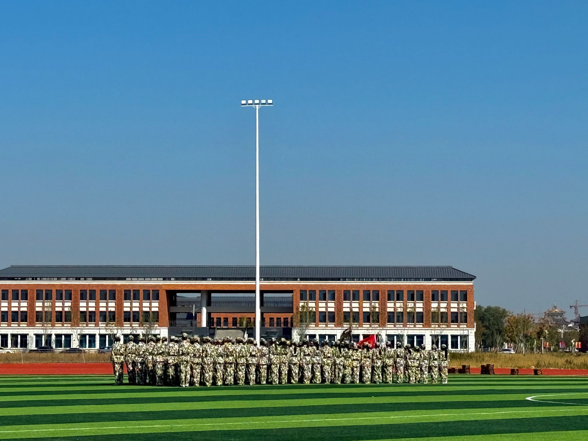 开营仪式在庄严的升旗仪式中正式开始。全体参训学生以整齐的队列、挺拔的军姿在国旗下齐唱国歌,展现出昂扬向上的精神风貌。教官代表于雷和学生代表赫玉浩分别发言。