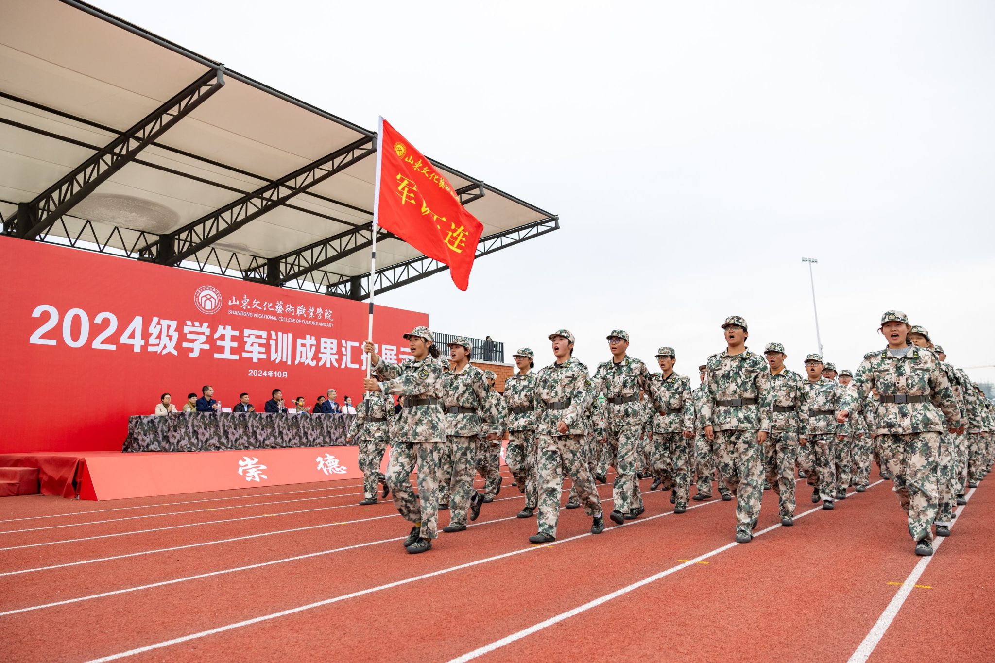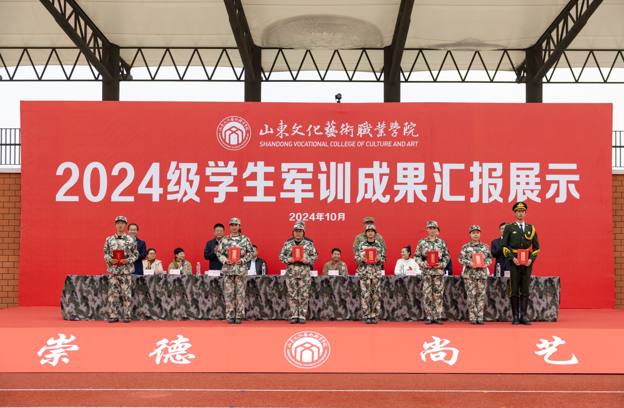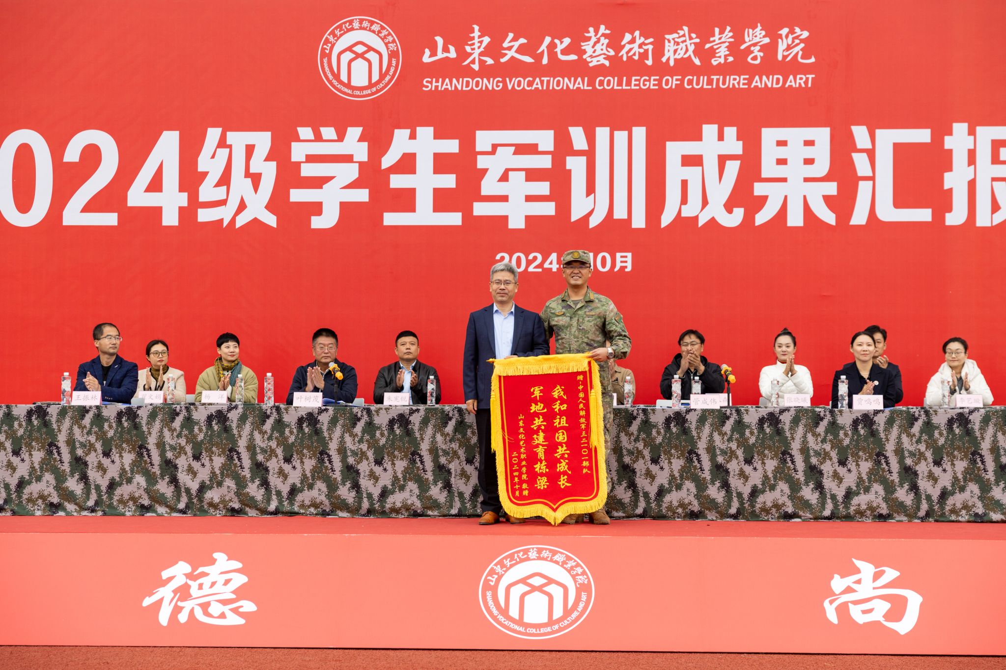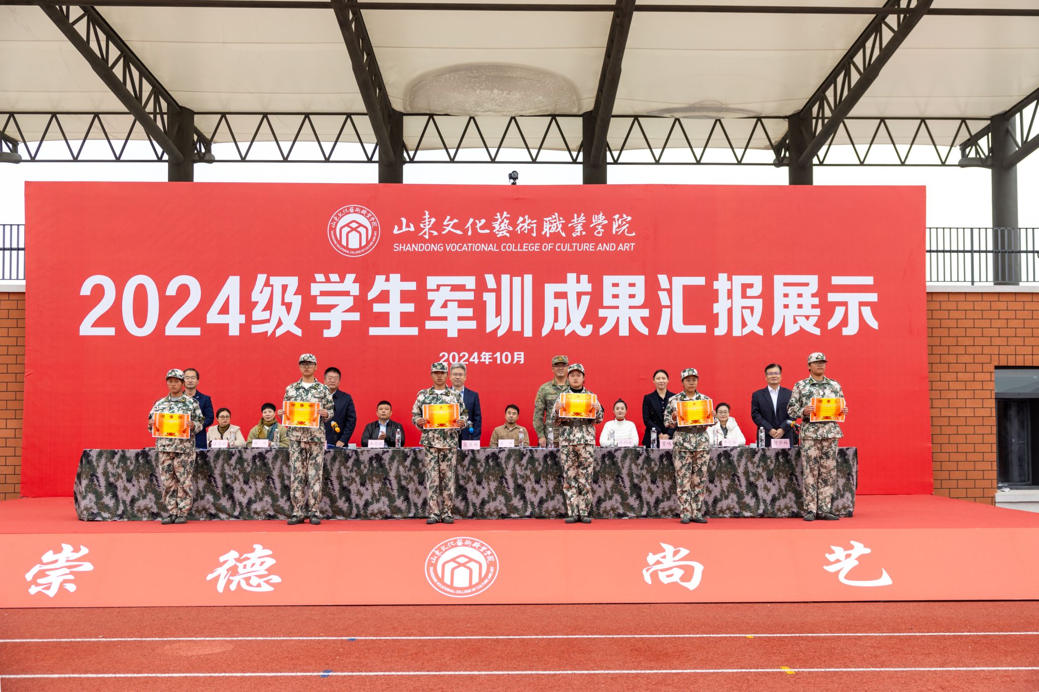10月21日,山东文化艺术职业学院2024级学生军训成果汇报展示活动在学院田径运动场隆重举行,学院临时党委书记张东林出席活动并讲话,院领导叶树茂、贾鸣鸣、王振林、胡学林参加活动,学院副书记叶树茂宣读《2024级学生军训表彰决定》,学院纪委书记胡学林主持活动。出席本次活动的还有承训部队首长、学院各职能处室、系部临时负责同志。