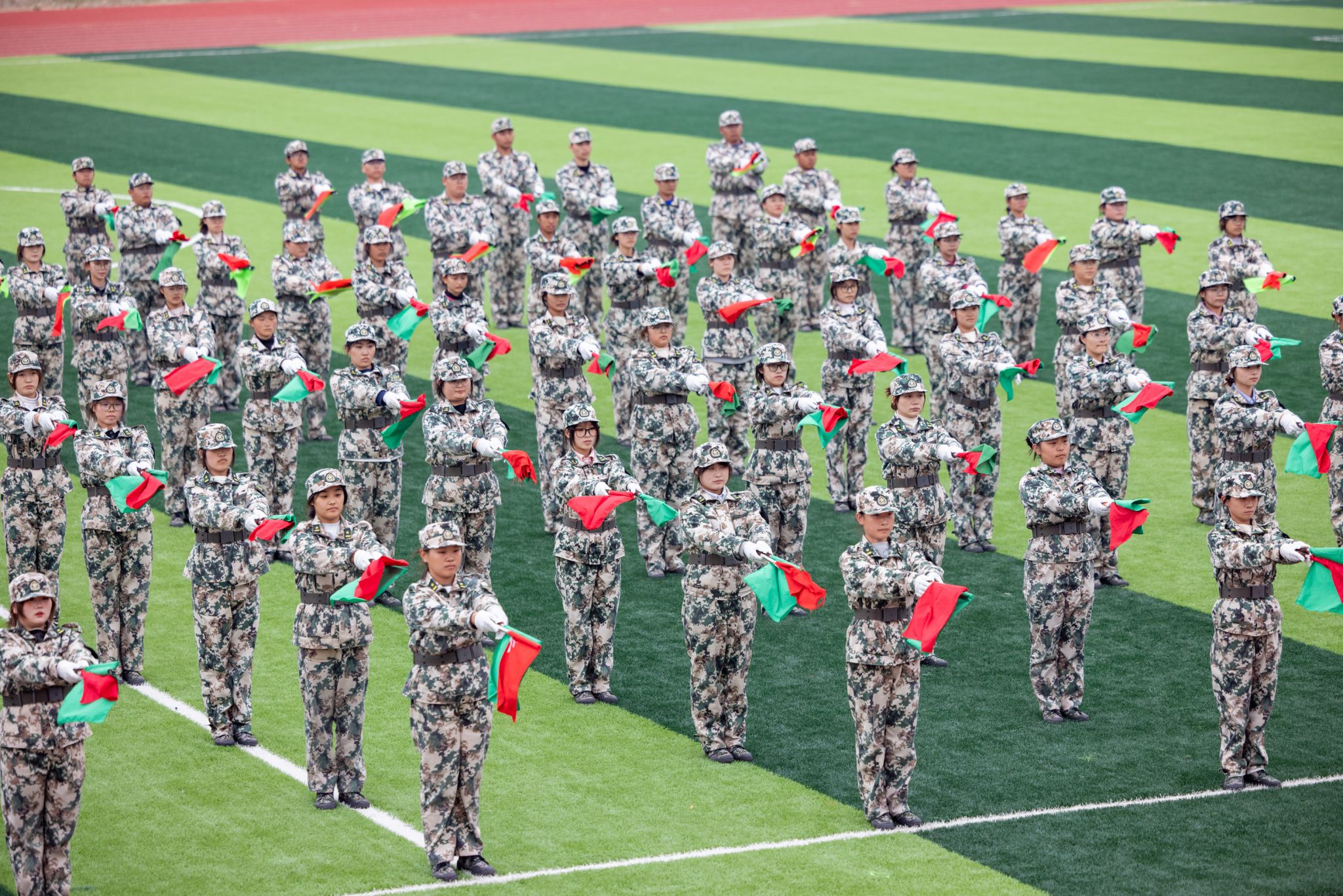 随后进行了四个军事训练科目的汇报展示。女子军体拳柔中带刚,展现出巾帼不让须眉的气势;男子刺杀操接替出场,气势磅礴,青涩面容上露出坚毅无比的眼神;旗语方阵铿锵有力,挥旗和手语动作整齐划一;战术动作展示刚猛利落,尽显军人的风采与战斗魅力。国旗护卫队标兵代表、军训标兵代表、军训先进宿舍代表、军训先进排代表、军训先进连代表依次上台领奖,学院领导为其颁奖。