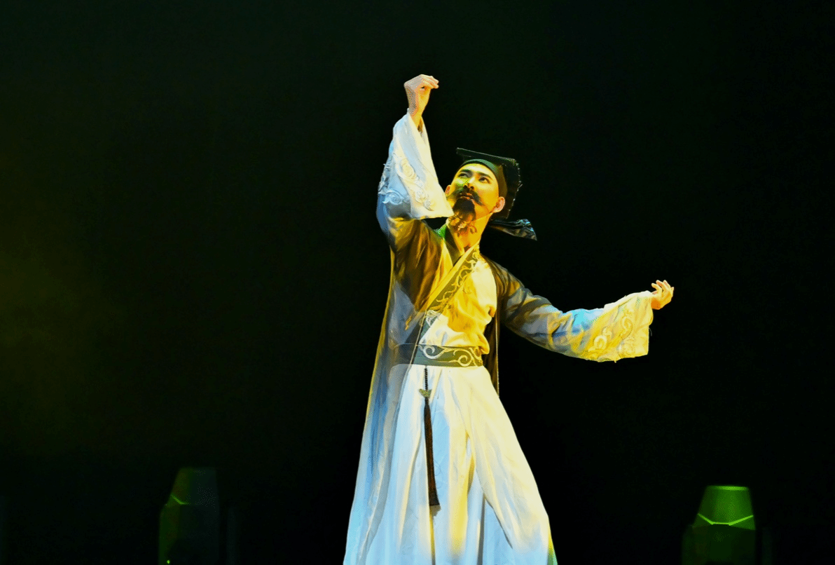 我院报送的男子独舞《醉墨兰亭》(编导:张宁),以“兰亭修褉”事件为切入点,展现了《兰亭序》的创作过程。作品由研墨、醉墨、泼墨、赏墨四部分构成,融入了东晋书法家“爱鹅”,“食墨”,“天下第一行书”的典故,表达了魏晋文人闲情雅致、及时行乐的人生态度以及对宇宙万物的感慨。仰观宇宙,俯察人生,纵时代更迭,世事变迁,世人心中皆有“兰亭”。