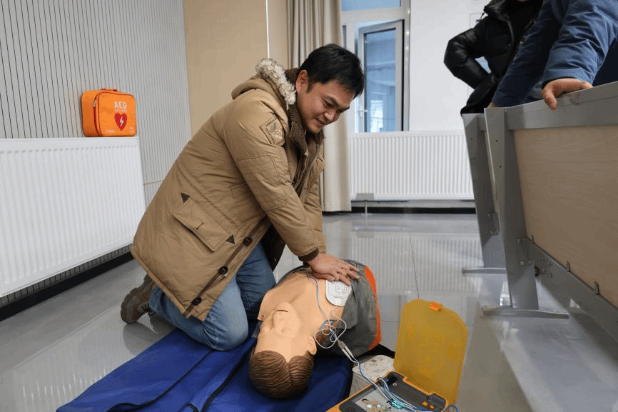 活动现场,红十字的专业人员详细讲解了心肺复苏、AED设备使用等技能,现场师生进行了理论考试与急救实操演练。全体老师和大部分学生通过了急救资格考核。