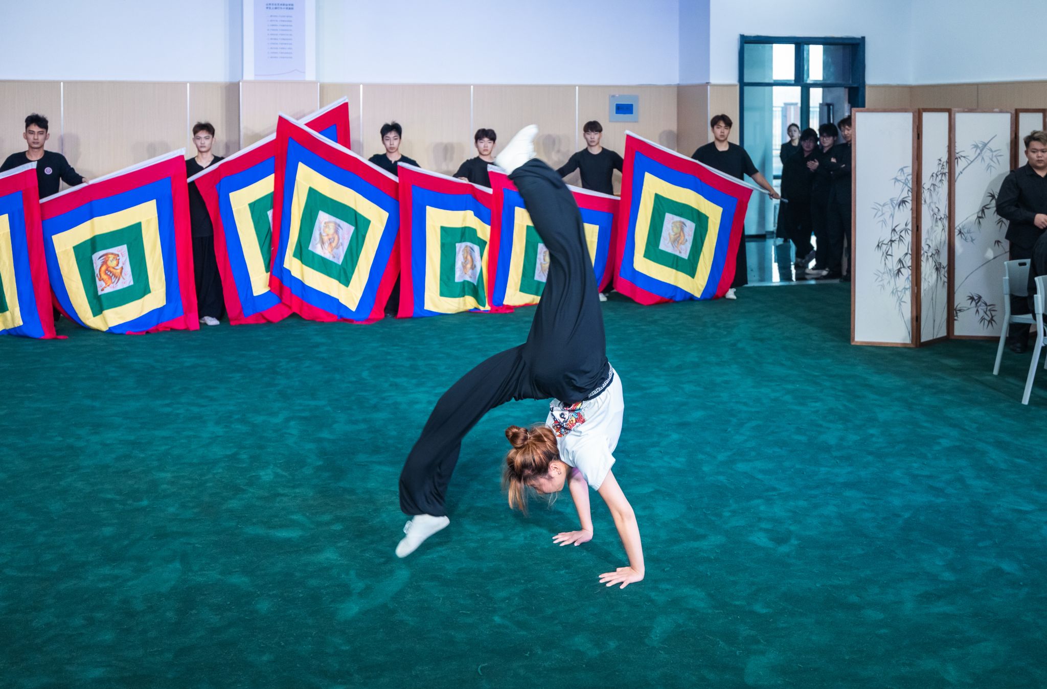 戏曲系汇报通过三个层次分明的节目展示教学成效。京剧曲牌《迎春》旋律明快,传递春之喜悦;打击乐《雁荡山》气势磅礴,还原宏大艺术场景;《精・气・神》集中展示腿功、身训、毯子功等基本功,同时呈现甩发功、帽翅功等特色技艺,扎实的功底与高难度技巧兼具,尽显梨园风采与戏曲传承的“精气神”。