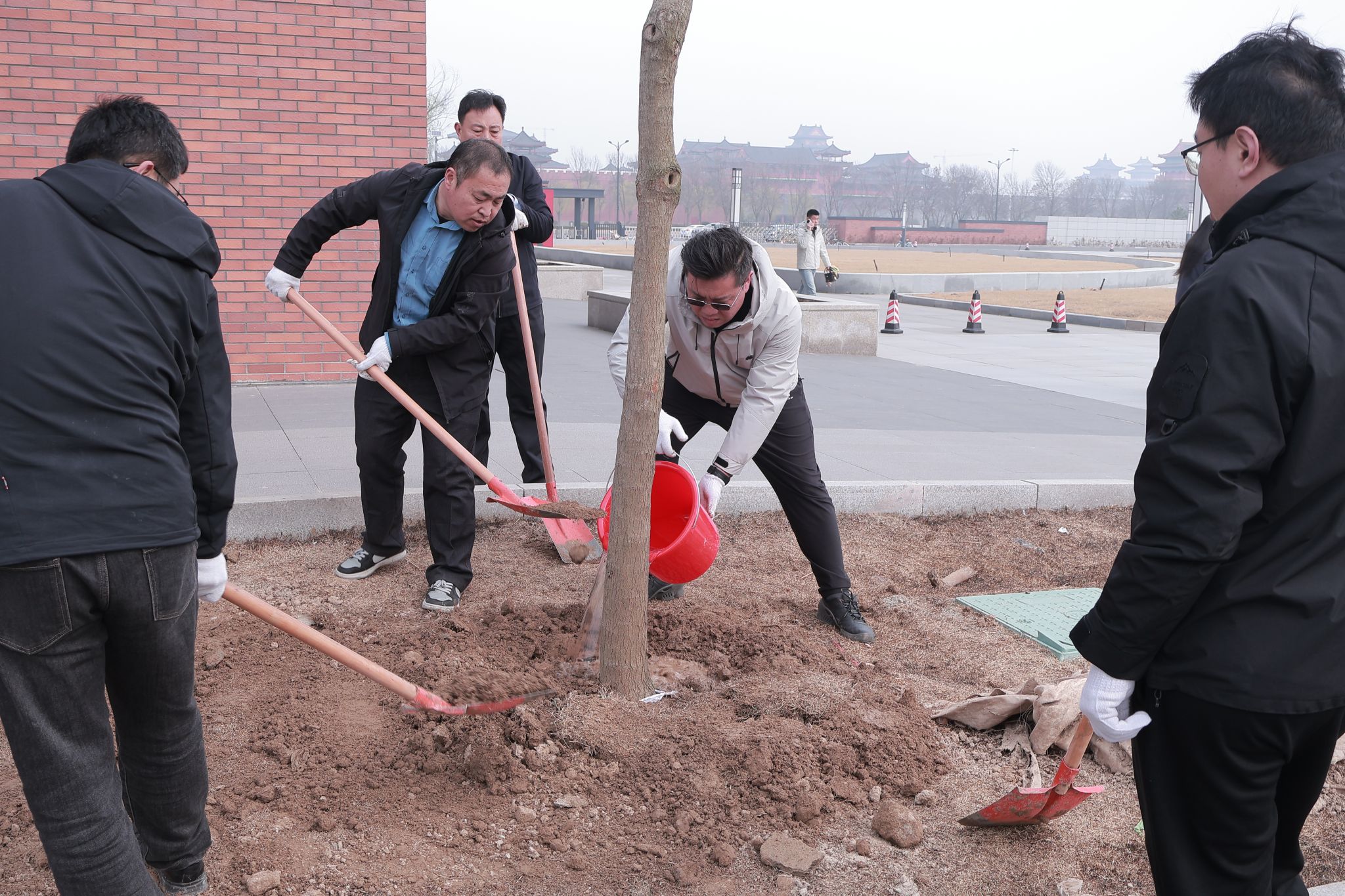 上午10点20分,活动拉开帷幕。活动现场,大家三五人一组,热情高涨、分工协作,挥锹铲土、扶苗填坑、提水浇灌,每一道工序都有条不紊。一棵棵树苗迎风挺立,错落有致,为美丽校园再添生态底色,也种下了大家对绿色家园的美好期盼,孕育着无限希望。