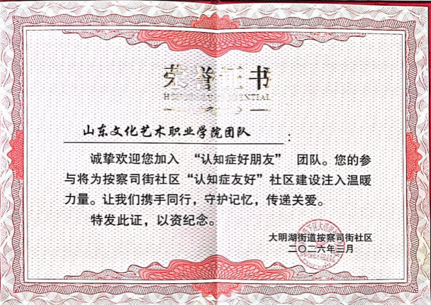 为响应国家应对人口老龄化战略,3月20日下午,山东文化艺术职业学院团委、空间艺术与文化遗产系参与济南市大明湖街道按察司街社区“按康忆伴”志愿服务队授旗仪式暨“守护记忆·温暖相伴”认知症关爱公益活动,围绕认知症长者关爱开展活动,以艺术之力赋能适老服务,以校社联动传递暖老温情。