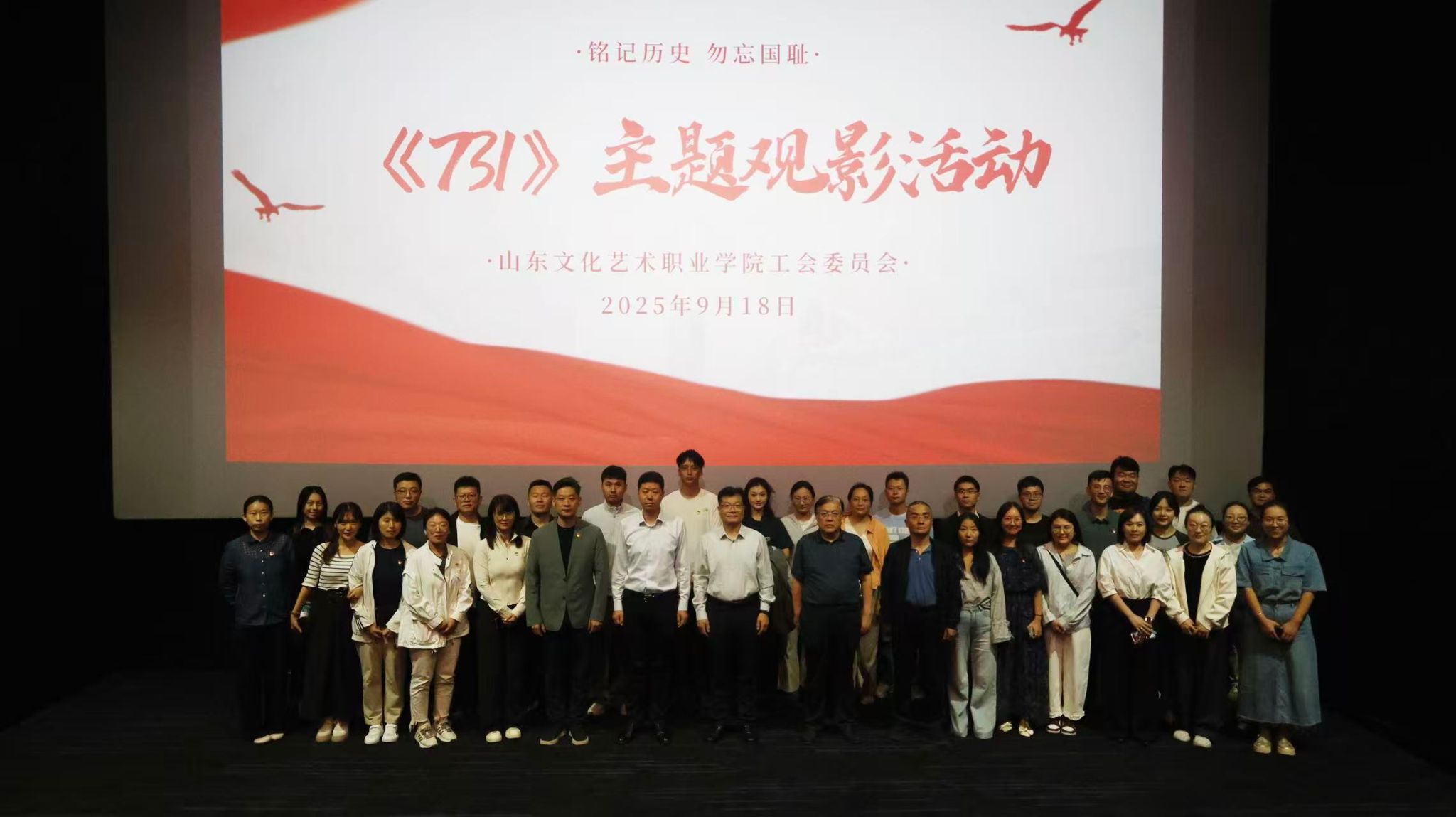 “铭记历史,勿忘国耻” 学院工会组织教职工集体观看《731》 2025年9月18日,为深切缅怀革命先烈与遇难同胞,弘扬爱国主义精神,我院工会在九一八事变94周年纪念日这个特殊日子里,组织全院教职工集体观看历史题材影片《731》,开展了一次深刻的爱国主义教育主题活动。《731》基于真实历史事件,讲述了在抗战胜利前夕,侵华日军为了扭转战局在中国东北地区哈尔滨市平房区开展细菌战研究,当地小贩王永章等人被强行抓入“特设监狱”,侵华日军以“配合健康检查与防疫研究即可换取自由”的虚伪承诺,... 2025-09-18