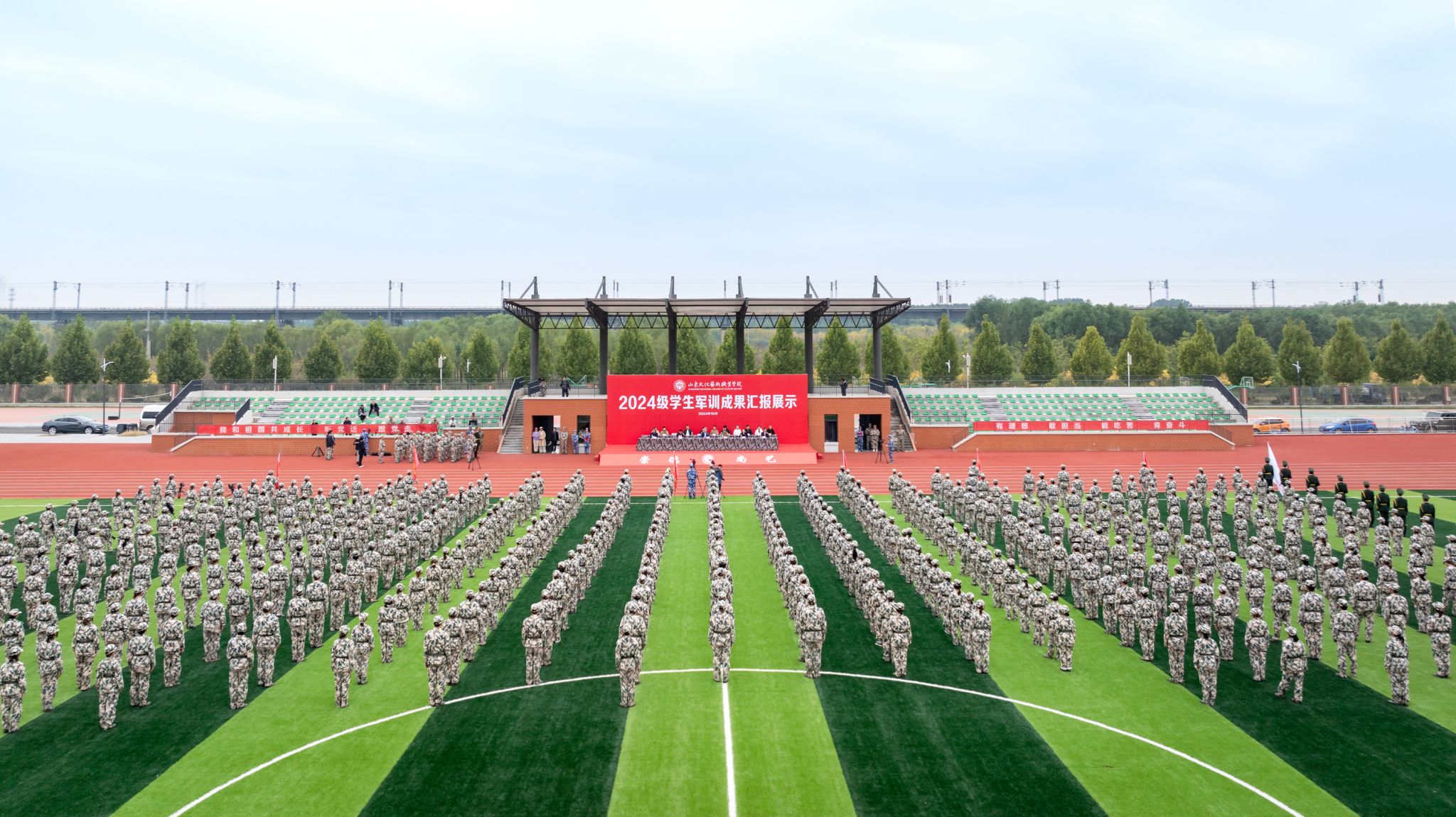 山东文化艺术职业学院举行2024级学生军训成果汇报展示 10月21日,山东文化艺术职业学院2024级学生军训成果汇报展示活动在学院田径运动场隆重举行,学院临时党委书记张东林出席活动并讲话,院领导叶树茂、贾鸣鸣、王振林、胡学林参加活动,学院副书记叶树茂宣读《2024级学生军训表彰决定》,学院纪委书记胡学林主持活动。出席本次活动的还有承训部队首长、学院各职能处室、系部临时负责同志。活动首先举行了庄严的升国旗、奏唱国歌仪式,以国旗护卫队为先导的六个方阵依次走过主席台接受检阅,... 2024-10-22