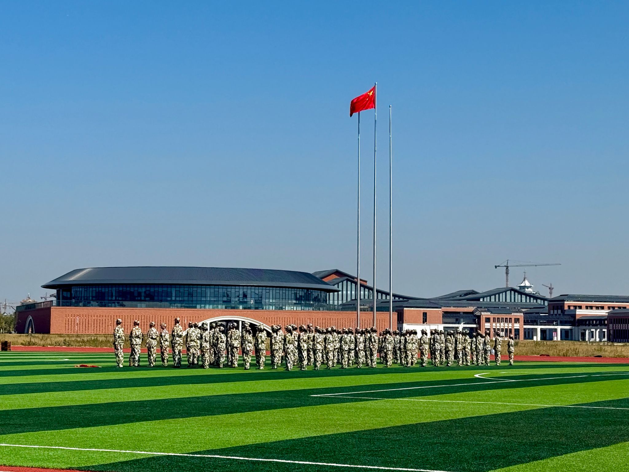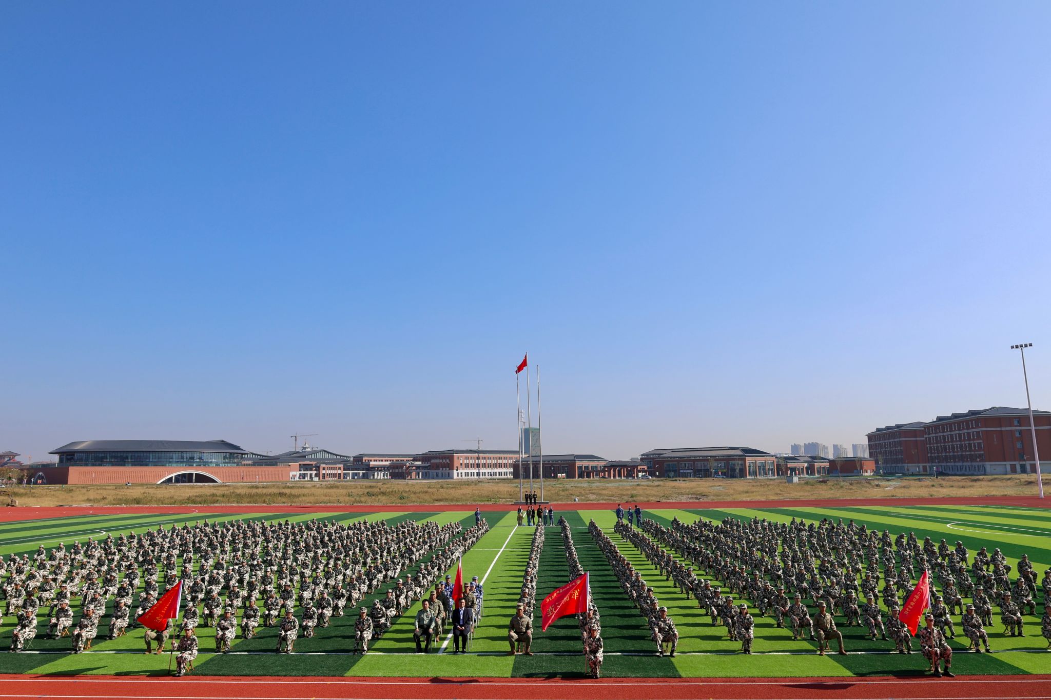 开营仪式在庄严的升旗仪式中正式开始。全体参训学生以整齐的队列、挺拔的军姿在国旗下齐唱国歌,展现出昂扬向上的精神风貌。教官代表于雷和学生代表赫玉浩分别发言。