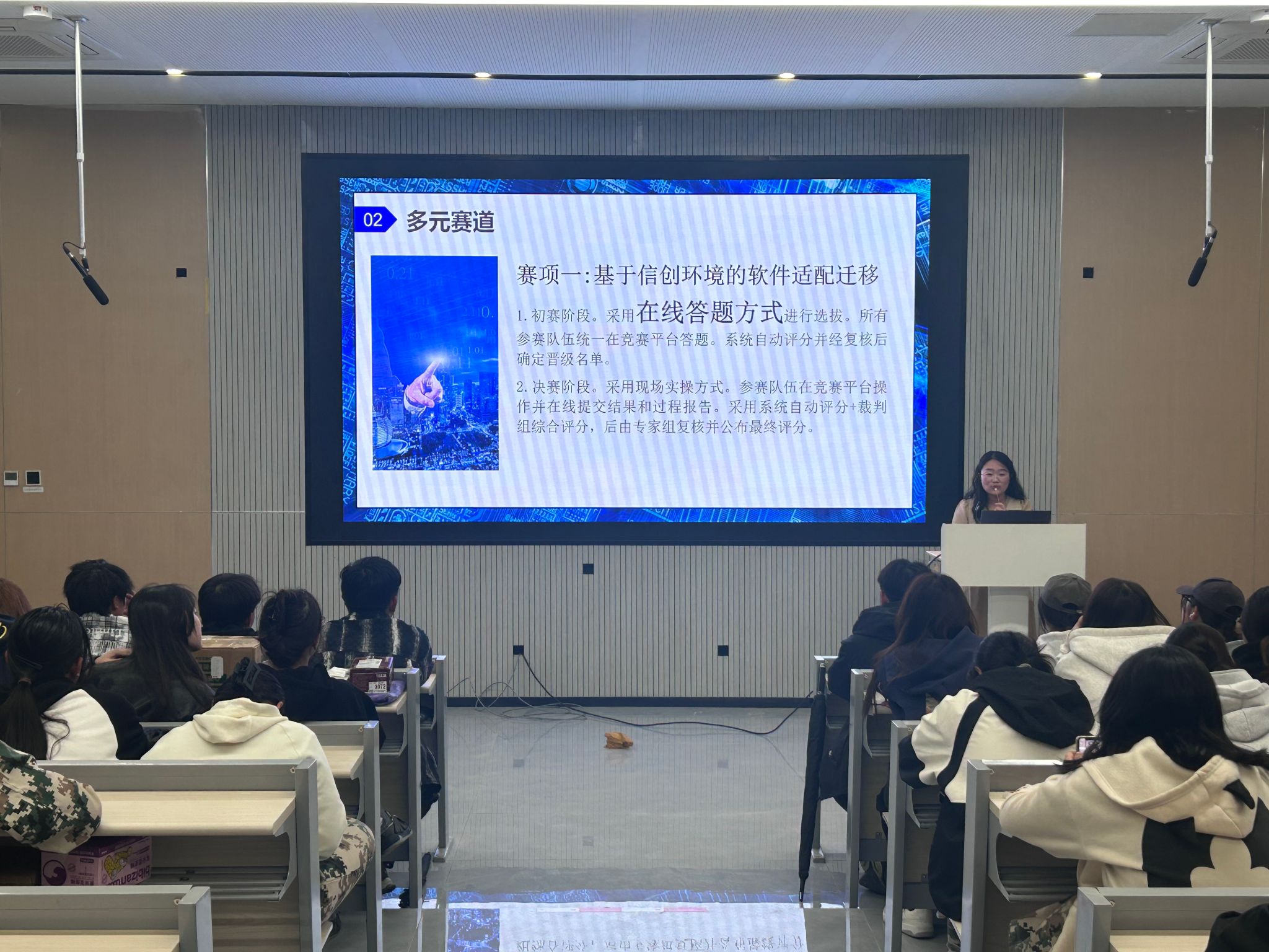宣讲会上,网络信息中心和公共教学部信息技术教师为全院学生进行了精彩宣讲,详细介绍了此次大赛背景、赛制安排、奖项设置、赛前培训及参赛注意事项。会后,学生们热情不减,纷纷积极咨询,深入了解参赛细节。教师们耐心解答,确保每位参赛者都明晰赛程,明确目标方向。