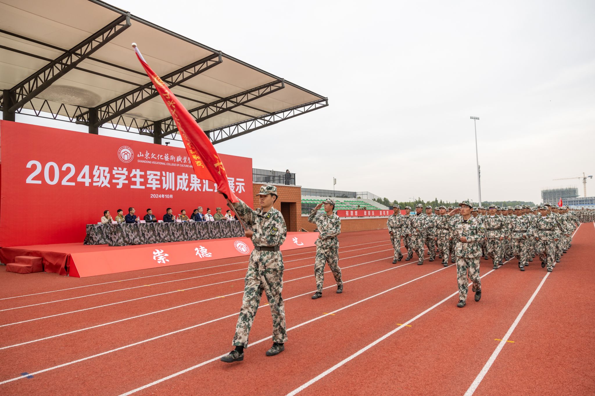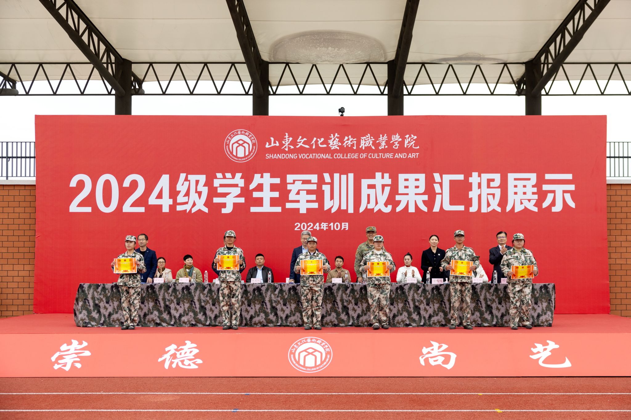 10月21日,山东文化艺术职业学院2024级学生军训成果汇报展示活动在学院田径运动场隆重举行,学院临时党委书记张东林出席活动并讲话,院领导叶树茂、贾鸣鸣、王振林、胡学林参加活动,学院副书记叶树茂宣读《2024级学生军训表彰决定》,学院纪委书记胡学林主持活动。出席本次活动的还有承训部队首长、学院各职能处室、系部临时负责同志。