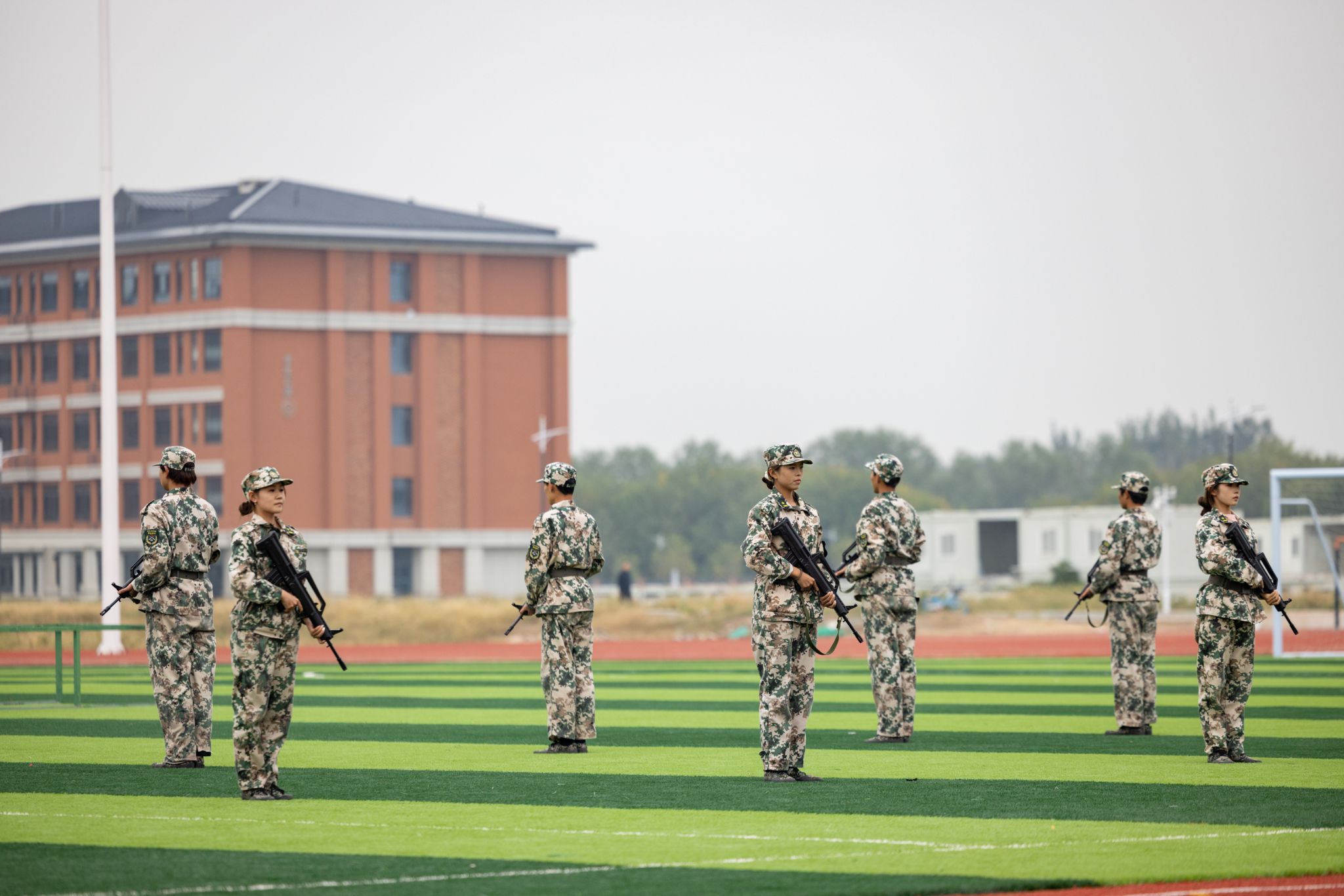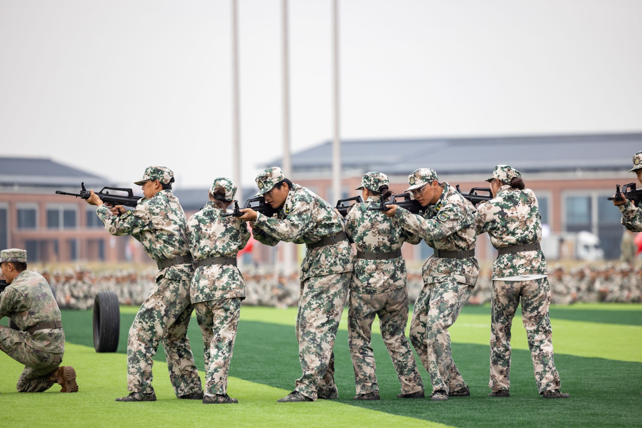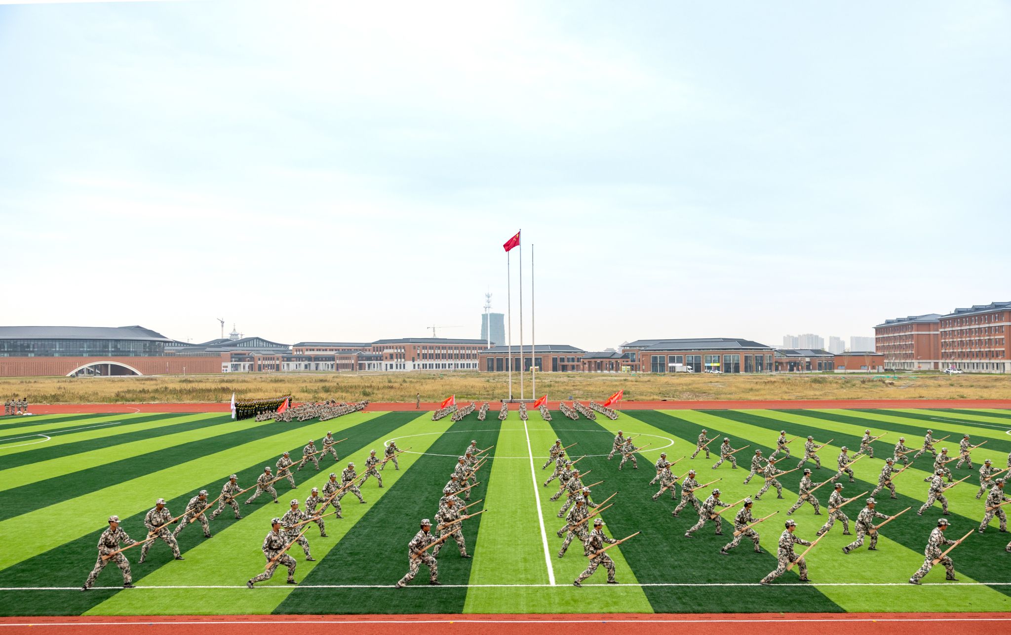 随后进行了四个军事训练科目的汇报展示。女子军体拳柔中带刚,展现出巾帼不让须眉的气势;男子刺杀操接替出场,气势磅礴,青涩面容上露出坚毅无比的眼神;旗语方阵铿锵有力,挥旗和手语动作整齐划一;战术动作展示刚猛利落,尽显军人的风采与战斗魅力。国旗护卫队标兵代表、军训标兵代表、军训先进宿舍代表、军训先进排代表、军训先进连代表依次上台领奖,学院领导为其颁奖。