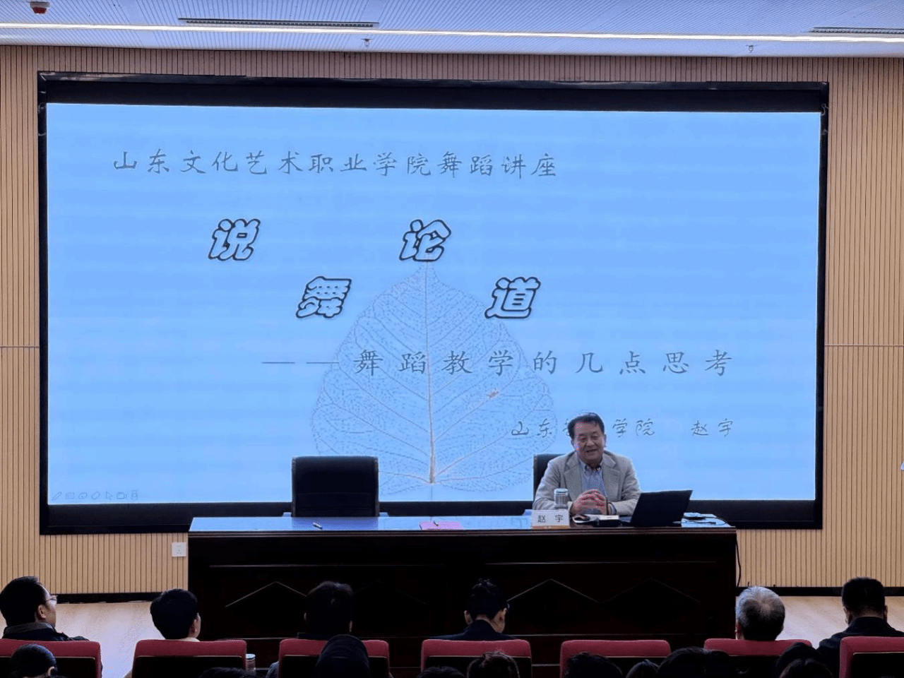 赵宇为在场师生带来了以《说舞论道——舞蹈教学的几点思考》为题的专题讲座。他以“说舞”“论道”为切入点,从“道”与学习方式的解释,舞蹈剧目的选择与表演,舞蹈意识的养成,舞蹈肢体语言的语气应用,以文化舞、文舞相融五个方面进行生动全面地讲解。