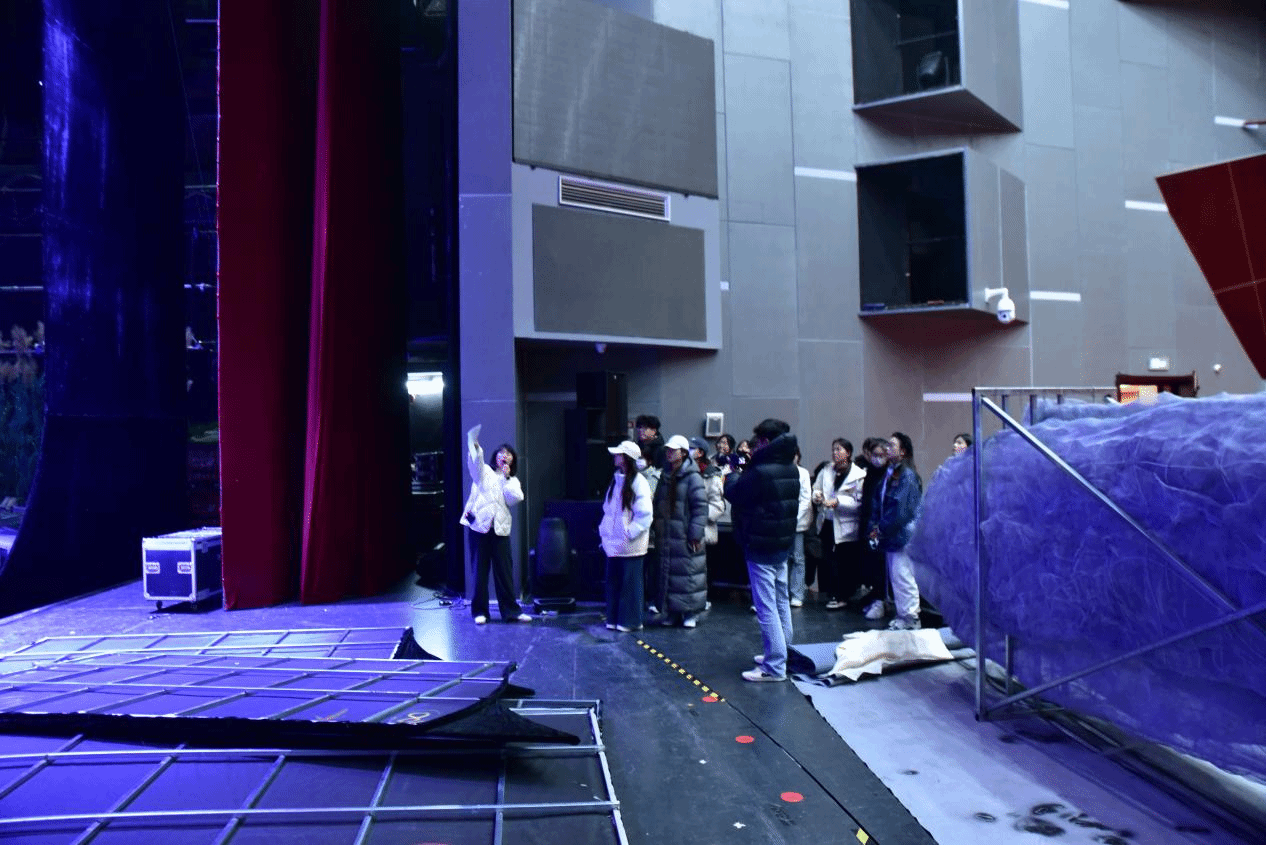 当天,剧场正在进行一场演出装台工作,舞台上放置的各种道具以及悬挂的幕布背景引发了同学们浓厚的兴趣。崔艺老师结合实物,讲授了道具制作和布景设计的相关知识,并延伸讲解到舞台艺术作为一门综合性学科,涵盖了舞台设计、灯光音响、服装化妆、舞台机械等多方面专业知识,鼓励学生们未来根据自己兴趣爱好选择自己的专业发展方向。