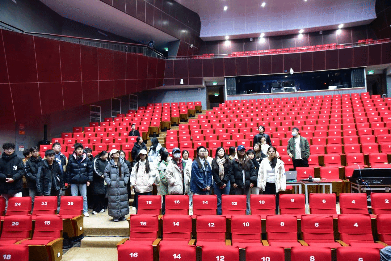 本次情景式实践活动旨在配合《剧场空间与设备通识》课程教学,让学生们能够更直观地了解剧场环境和配套设备,从而提高学生对舞台专业知识的理解和认知。在卢晓丹老师的带领下,舞美1班参观了剧场的各个区域,包括舞台、观众席、音控室、化妆间等,深入了解了剧场的硬件设施和设备布局、功能等。现场教学环节,学生们积极参与互动交流,提出了许多关于剧场舞台的专业问题,卢老师耐心的进行了解答。在深入幕后的学习中,同学们了解了演员上下场的动线,见识到了剧场先进的控制设备,深刻的感受到了舞台工作的专业性。
