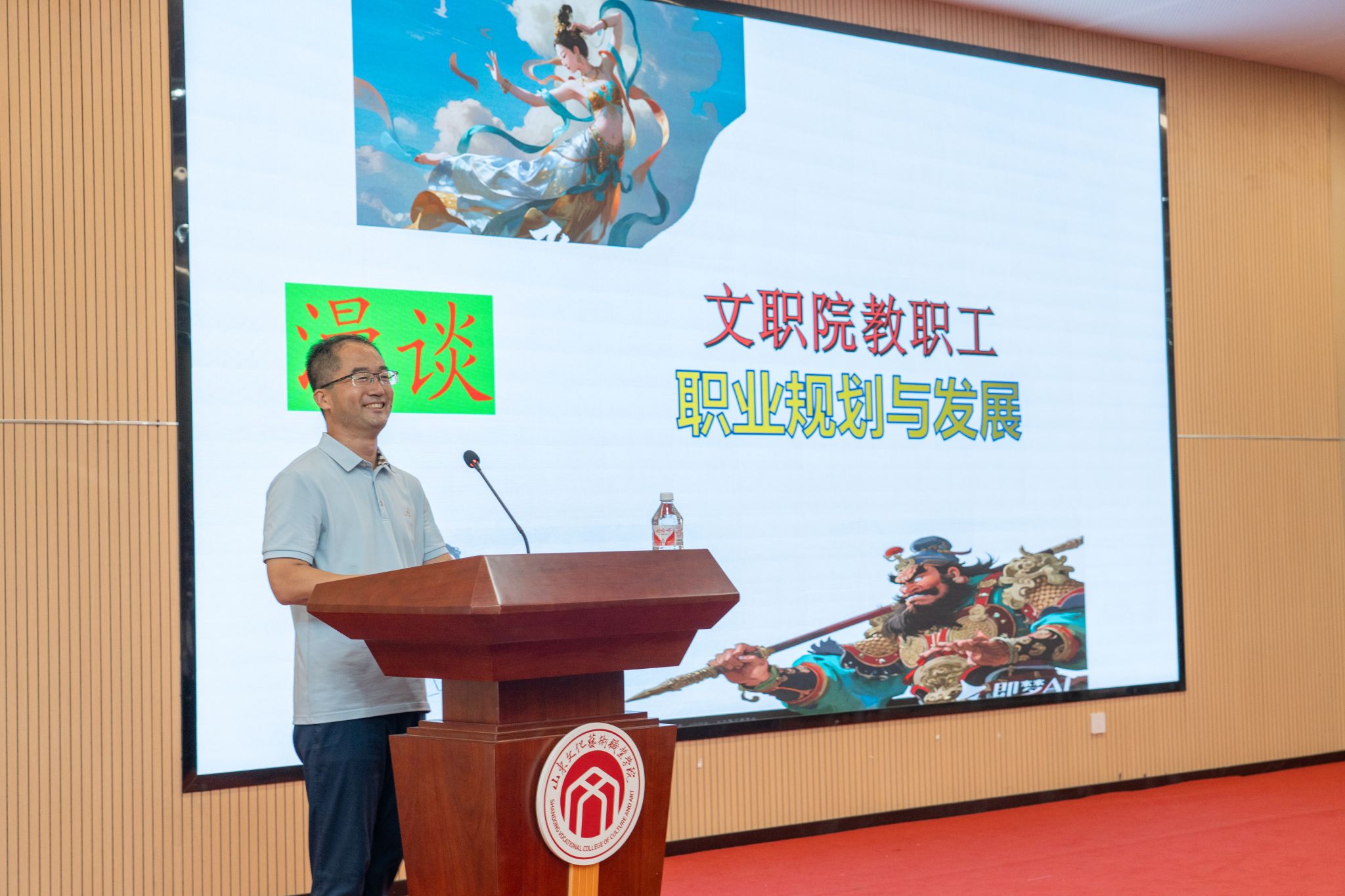 学院副院长王振林面向全体教职工开展职业规划与发展专题培训。他紧扣高职院校“人才培养、科学研究、社会服务、文化传承、国际交流”五大职能,从“教职工应关注什么?未来可以成为什么?”等十二个维度,为专任教师、辅导员、行政管理等不同岗位教职工清晰指明了职业发展方向与路径。