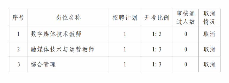 山东文化艺术职业学院2025年公开招聘人员报名及资格初审工作结束。根据省委组织部、省人力资源社会保障厅《关于印发2025年度省属事业单位公开招聘工作实施方案的通知》(鲁人社发〔2024〕15号)和《山东文化艺术职业学院2025年度公开招聘人员公告》规定,报名结束后,对应聘人数达不到规定比例的招聘岗位,计划招聘1人的,取消招聘岗位。现将取消招聘岗位情况予以公布。