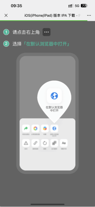 如果您是在微信、钉钉、支付宝等应用中打开安装页面,这些应用内置的浏览器无法直接进行安装操作。请按照以下步骤在 Safari 浏览器中打开安装页面: